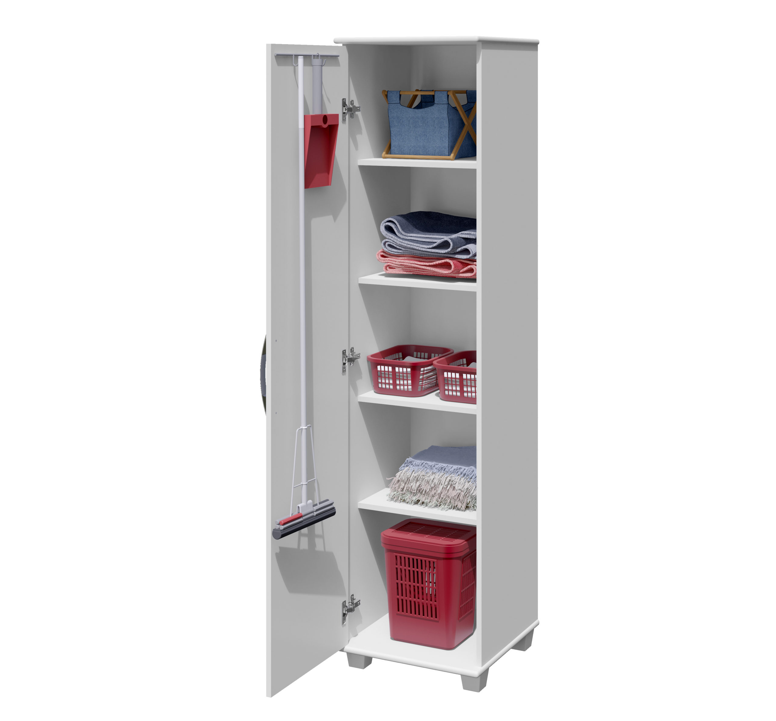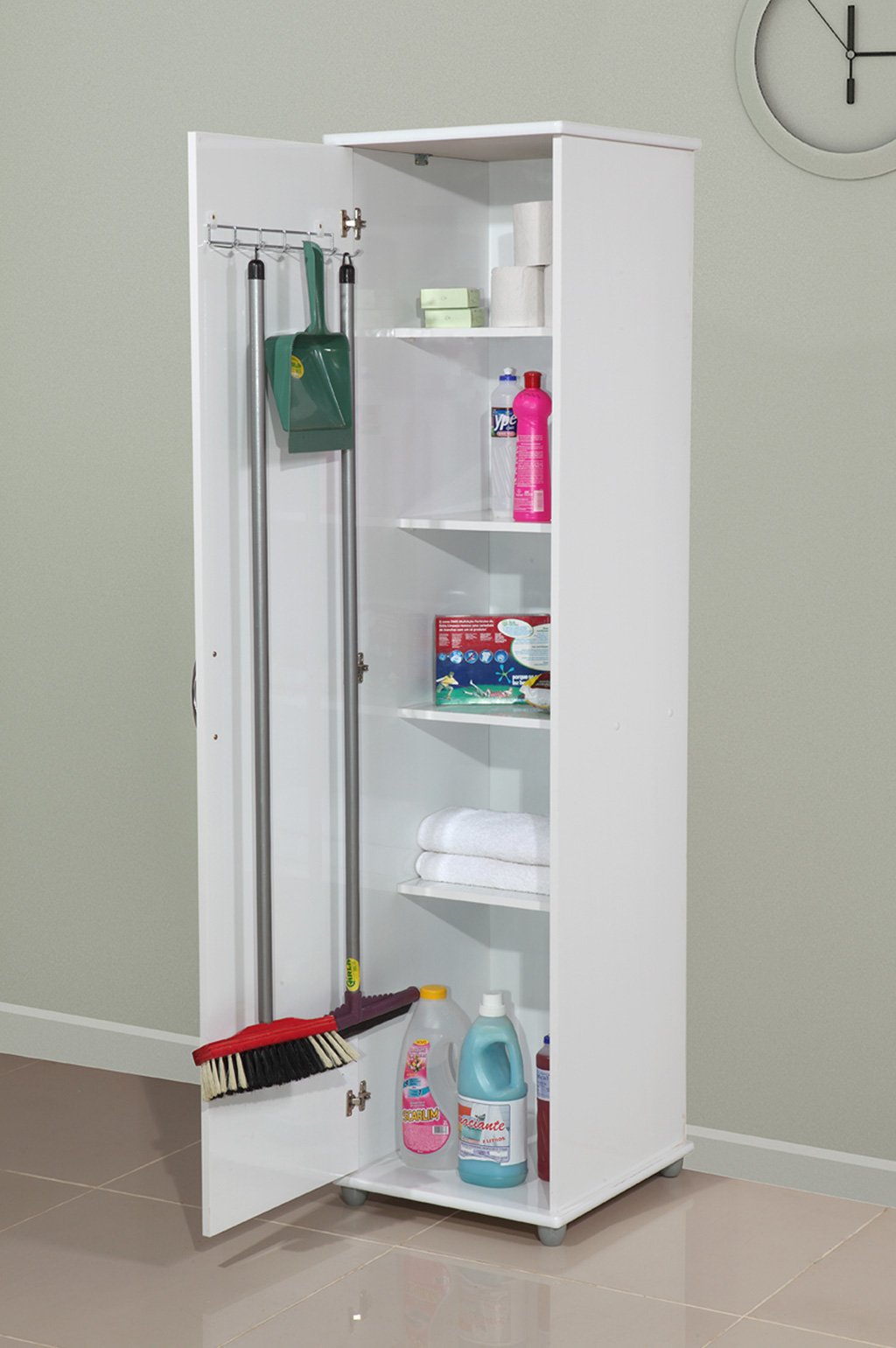 4 Prateleiras internas ,Bordas arredondadas e pintadas ,cabide de vassoras ,Tampo e base MDF de 18mm |
