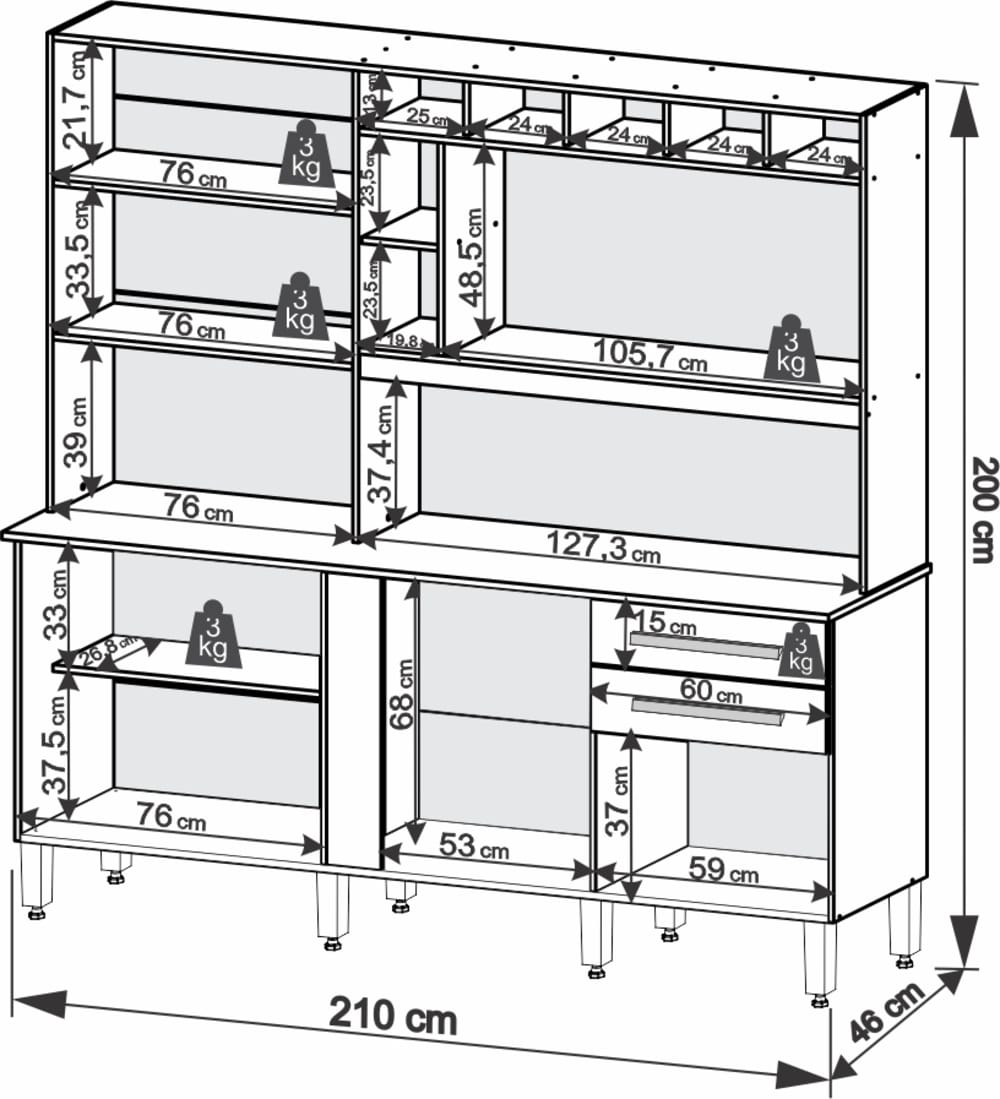 Altura:200cm Largura: 210cm Profundidade: 46cm |
