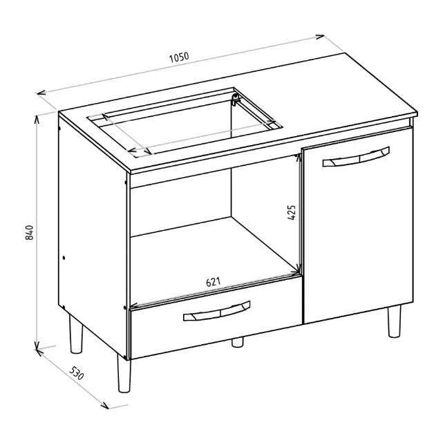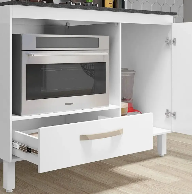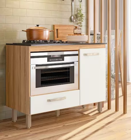 Com um tampo robusto já pronto para a instalação do seu cooktop, ele também oferece uma porta e uma gaveta espaçosas, ideais para guardar utensílios, panelas e outros acessórios de cozinha, mantendo tudo organizado e acessível.
