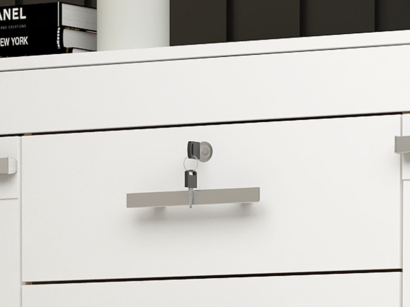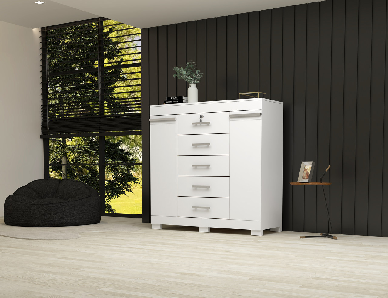 5 Gavetas com corrediças metálicas ,Com chave ,Estrutura em MDF |