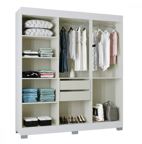 O design clean e contemporâneo deste guarda-roupa garante que ele se adapte facilmente a qualquer estilo de decoração, tornando-o uma adição versátil a qualquer espaço. As portas são práticas e economizam espaço, enquanto a gaveta adicional oferece espaço extra para pequenos itens.