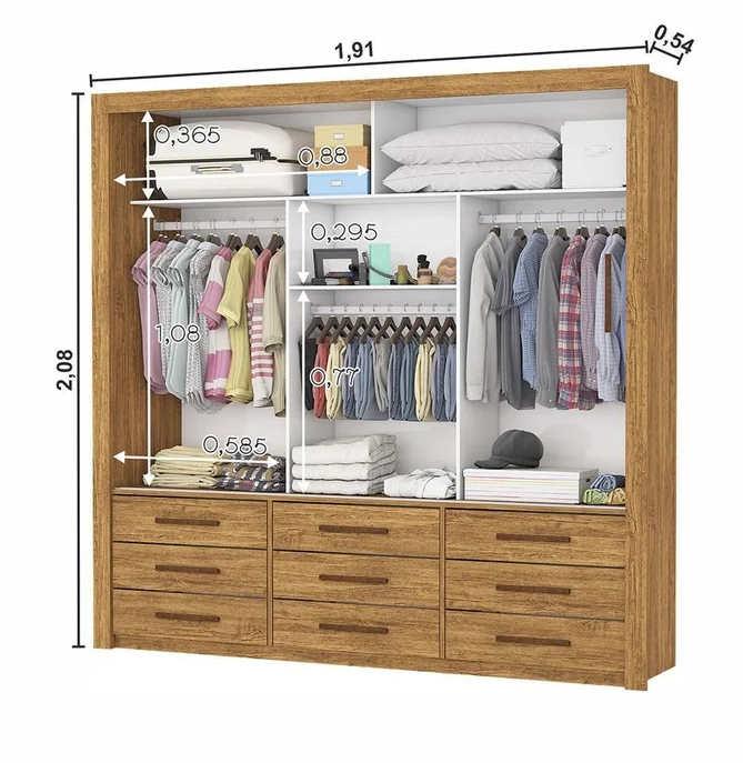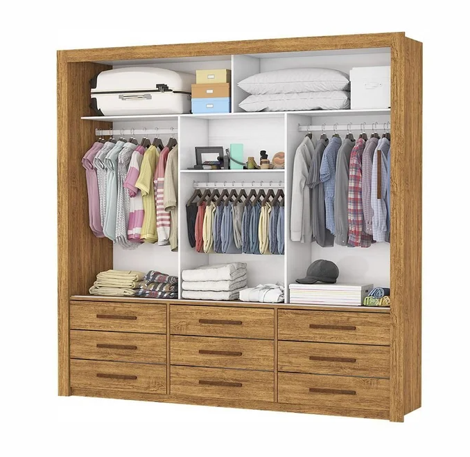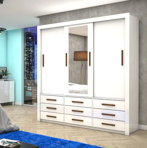 Ele possui 9 gavetas e 3 portas de correr, que facilitam na hora de armazenar e manter todas as roupas bem organizadas. Aproveite!