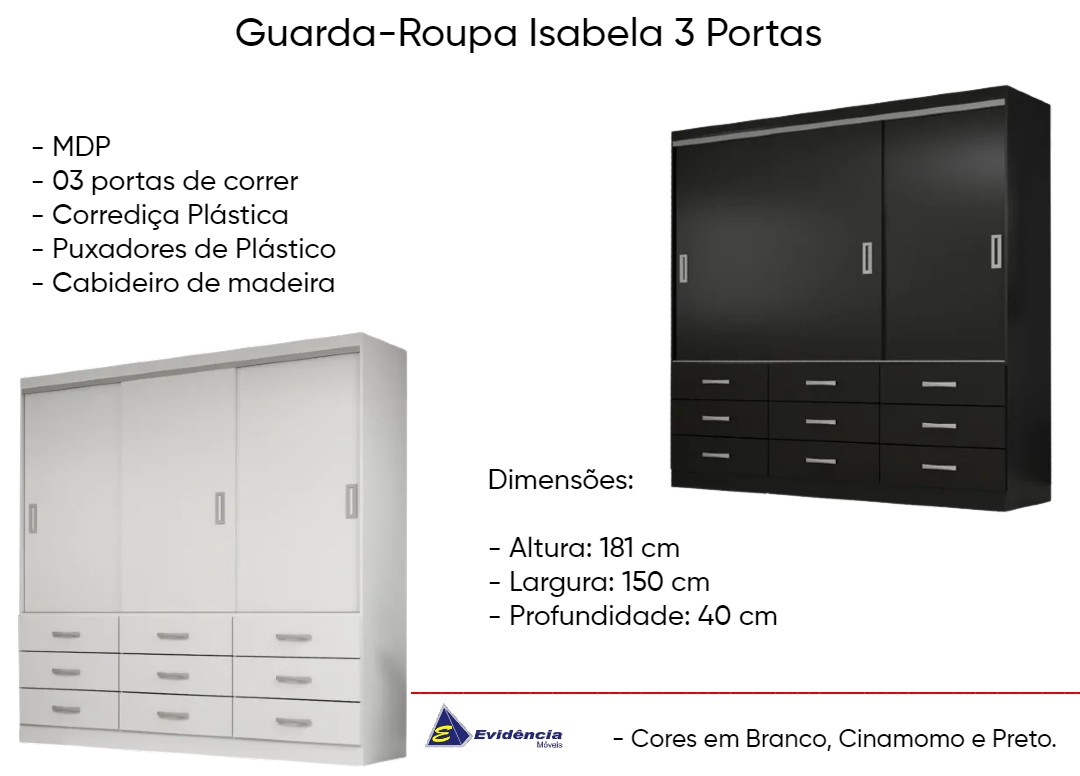 Guarda Roupa Isabela Casal 3 Portas 9 Gavetas Evidencia