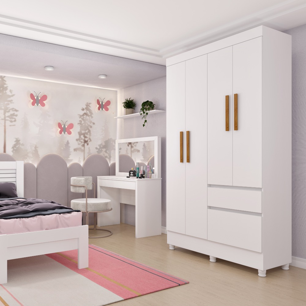 o Guarda-Roupa Oregon é perfeito para levar mais praticidade ao quarto de solteiro. Com 4 portas e 2 gavetas, ele tem espaço para acomodar perfeitamente suas roupas e acessórios, deixando tudo pronto para a rotina diária. De visual neutro, o móvel é de simples ambientação com o restante dos móveis pertinentes ao ambiente, te ajudando a deixar a decoração do seu quarto como você sempre sonhou. Agora, você não terá mais preocupações com a bagunça!