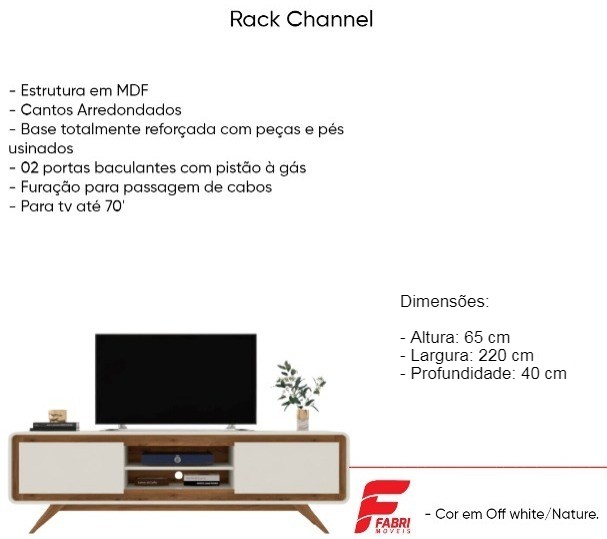 O Rack Channel 220cm para TV até 65 Polegadas 2 Portas Fabrimóveis Off White Nature é inspirado em elementos de design moderno, ideal para complementar seu mobiliário, tornando o ambiente em que estiver muito mais luxuoso, proporcionando elegância e sofisticação. Aproveite!