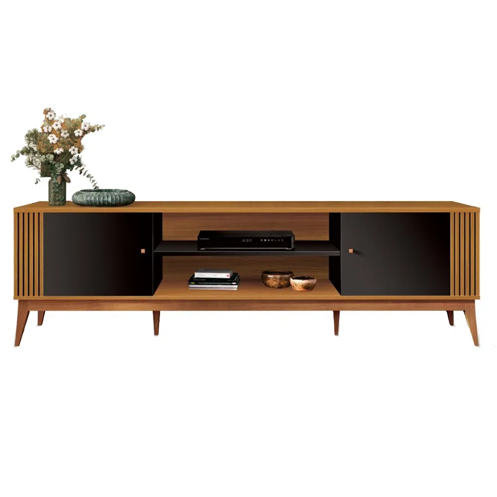 Acabamento ripado. Dobradiças metálicas. Puxadores em ABS Tampo de 25mm Pés em madeira maciça. TV 65" |