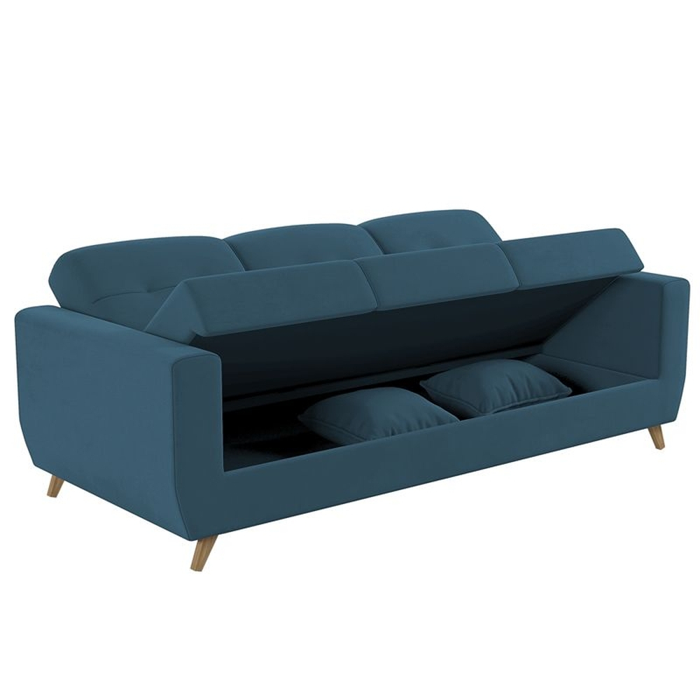 3 Posições ( sentado, leitura e descanso) ,4 pés de madeira ,Assento espuma D26 ,Baú abaixo do assento ,Percintas elásticas + Molas Espirais ,Tecido Veludo |