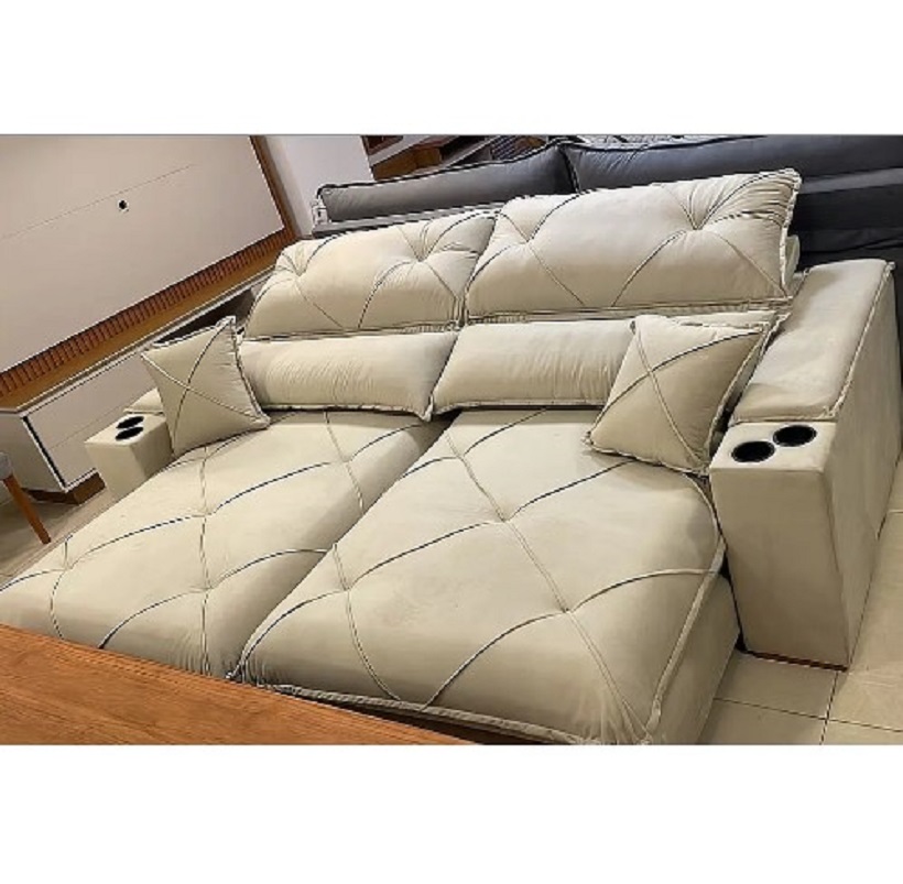 Todo ele é coberto com um tecido que é um luxo. É super macio ao toque, liso e fofo, dando uma sensação de aconchego. Este sofá não é apenas um móvel, é um convite ao conforto e ao descanso. Ele transforma qualquer sala de estar em um cantinho especial para você e sua família, onde todos podem se reunir e aproveitar momentos de paz e tranquilidade. Com ele, a sua sala se torna o lugar preferido da casa.